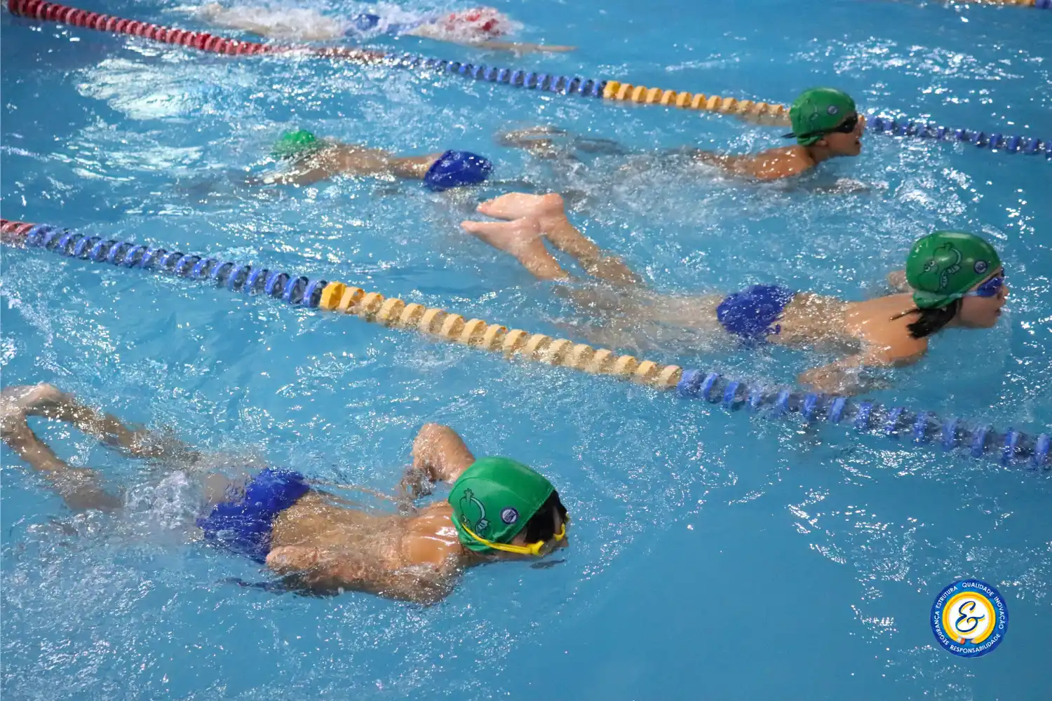 As aulas de natação promovem o desenvolvimento motor, a disciplina, a autoconfiança e a saúde cardiovascular dos alunos desde a infância.